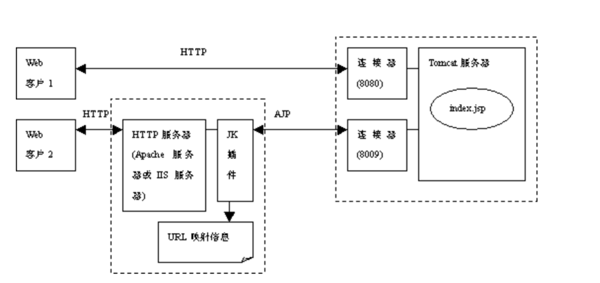 由于tomcat的html和圖片解析功能相對其他服務器如apche等較弱,所以,一般都是集成起來使用,只有jsp和servlet服務交由tomcat處理,而tomcat和其他服務器的集成,就是通過ajp協(xié)議來完成的。Web客戶訪問Tomcat服務器上JSP組件的兩種方式如圖所示。