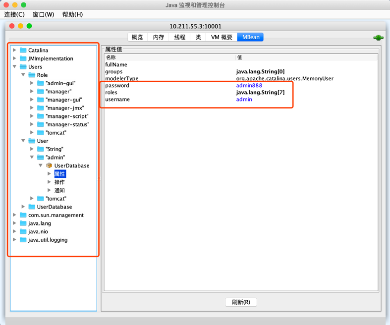 同樣的可以通過查看MBean看到tomcat manager配置的賬號密碼,除此之外,還能添加賬號,從而添加后門賬號。