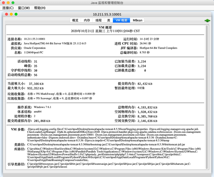 連接之后,我們可以通過jconsole的頁面看到許多的敏感信息,這些與前面的manager-jmx類似。