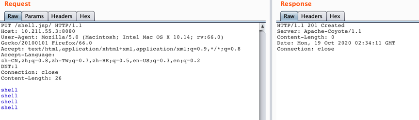 構造PUT上傳數據包,上傳時內容可以寫jsp一句話木馬,上傳返回201時,表示上傳成功,訪問該文件即可。